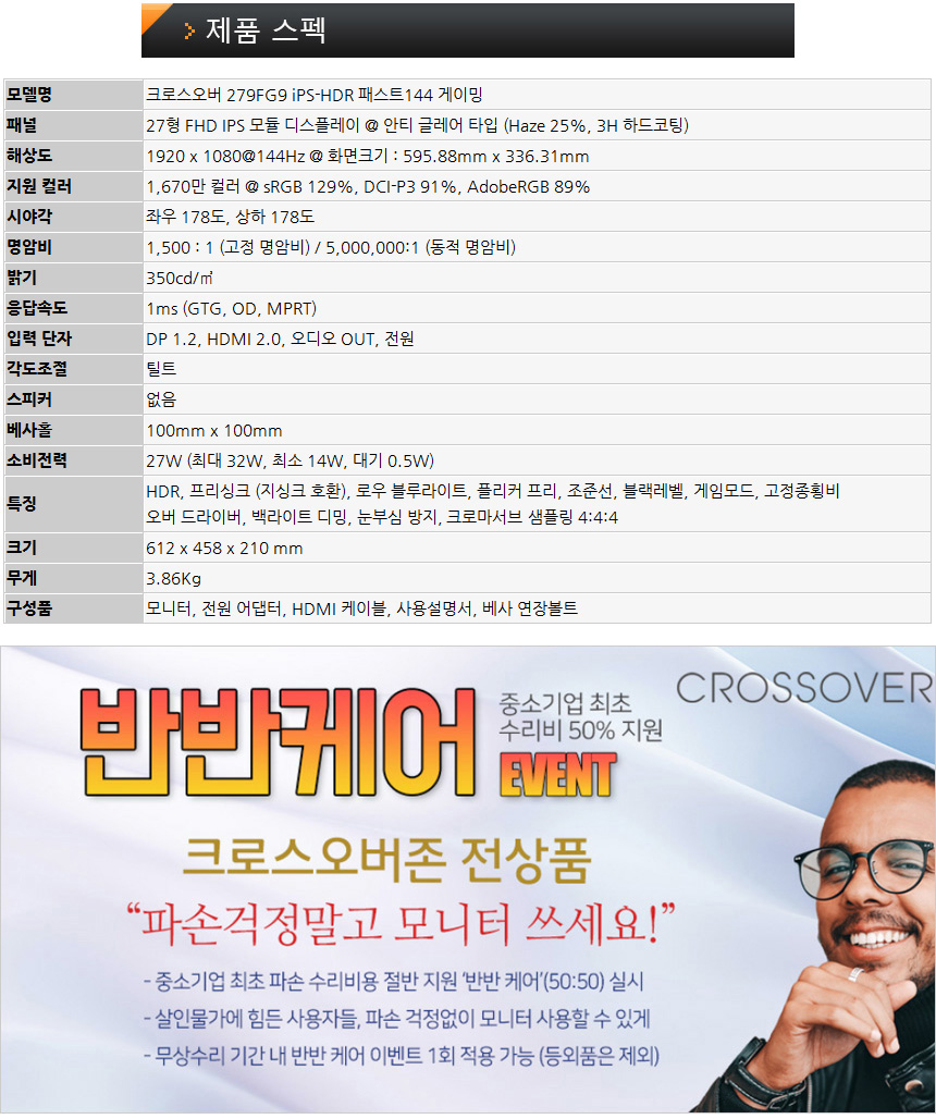 가성비를 높였지만 화질도 준수한 게이밍 모니터, 크로스오버 279FG9 iPS-HDR 패스트144 게이밍