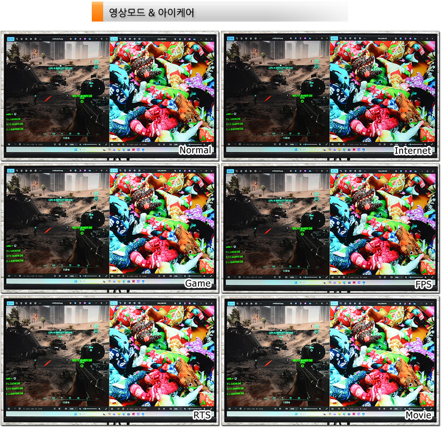 다양한 화면모드 지원으로 컨텐츠에 최적화된 영상을 즐길 수 있다. 상단의 사진은 지원 모드를 비교한 모습으로 (노멀 밝기 50) 밝기등이 달라지는 것을 확인할 수 있었다. (일일이 밝기를 조정할 필요가 없다. 평소에는 낮은 밝기로 사용하다가 게임을 즐길때 모드를 변경해 주면 된다.)