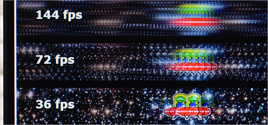144Hz 주사율을 지원해 게이밍 모니터로 활용할 수 있다. 여기에 1ms 응답속도와 높은 밝기를 지원해 디아블로나 P의 거짓과 같이 어두운 배경이 주를 이루는 게임을 편하게 게임을 즐길 수 있다. 상단의 사진은 144Hz 의 높은 주사율을 쉽게 확인할 수 있도록 하위 프레임과 같이 재생되는 영상 (960 Pixel Per Sec) 을 셔터스피드 1/20 로 촬영한 모습으로 프레임이 낮을수록 캐릭터의 수가 적으며 프레임이 높아질수록 시간당 많은 화면이 뿌려지기 때문에 캐릭터의 수가 많은 것을 확인할 수 있다.