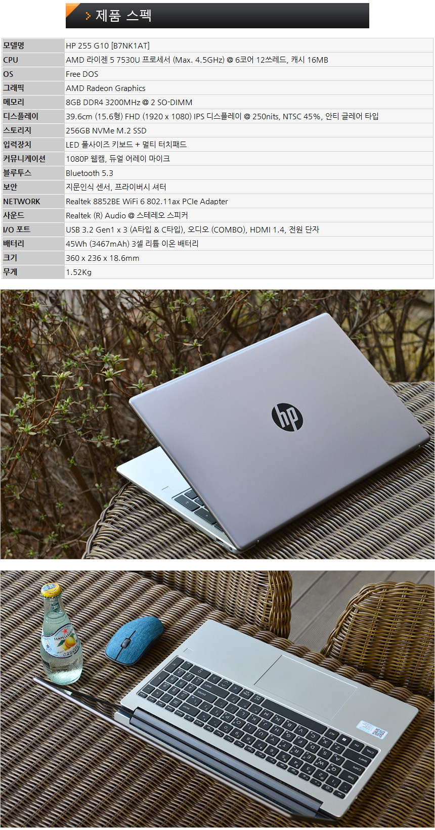 이번에 리뷰를 진행 할 HP 255 G10 B7NK1AT 는 힙라적인 가격에 다용도로 활용할 수 있는 노트북이 필요한 대학생이나 직장인을 위한 모델로 100만원을 훌쩍 넘는 일반적인 비즈니스 노트북과 달리 70만원 미만의 가격으로 (최저가 기준) 부담을 최소화 했으며 6코어 12쓰레드에 16MB 캐시를 지원하는 AMD 라이젠 5 7530U 프로세서를 탑재해 문서작업은 물론 디자인이나 고성능을 필요로 하는 업무용 S/W도 부드럽게 실행할 수 있다.