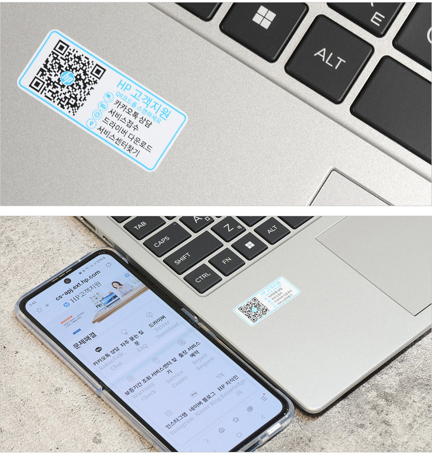 노트북에 문제가 생겼을때 팜래스트에 부착된 QR코드를 스캔해 주면 HP 고객지원 센터로 연결되어 손쉽게 조치를 받을 수 있으며 윈도우 설치시 드라이버를 다운로드 받을 수 있다. 특히 유저들이 많이 사용하는 카카오톡 상담 기능을 지원해 통화를 선호하지 않는 유저들이 편하게 사용할 수 있다.