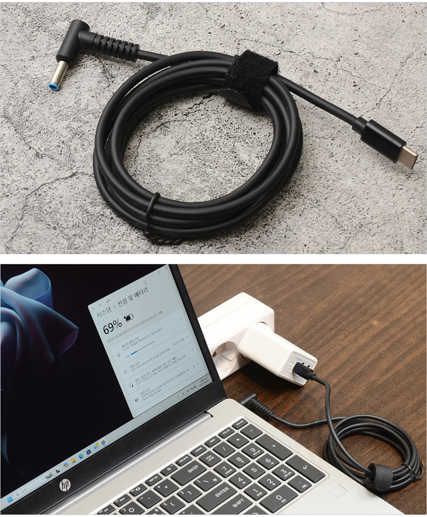 이 제품은 100만원 이상의 고급형 노트북과 달리 PD충전을 지원하지 않는다. 하지만 C타입 to DC 케이블을 사용하면 PD충전기 사용이 가능하다. 상단의 사진은 65W PD충전기를 이용해 노트북을 충전하고 있는 모습으로 정상 작동하는 것을 확인할 수 있었다. (집과 사무실에서 노트북을 사용할 때 충전기를 들고 다닐 필요가 없다.) @ C타입 to DC 케이블은 서드파티에서 만원 이하에 구입할 수 있다. (참고로 DC 전원부 외경은 4.5mm 이다.)