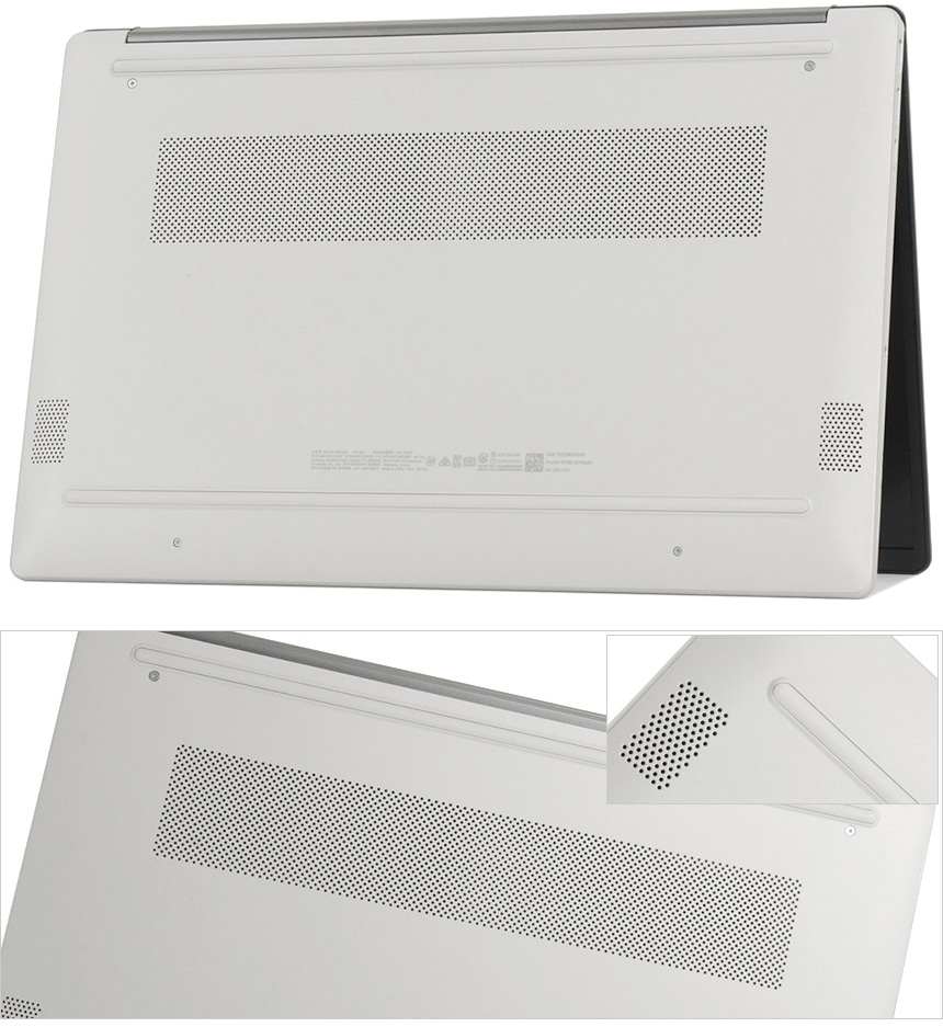 노트북 바닥면의 모습으로 팬과 칩셋이 설치된 부분에 통풍구가 설치되어 있으며 상단과 하단에는 고무패드가 부착되어 미끄러짐을 방지한다. 또한 하단 양 측면에는 스피커가 장착되어 시원한 사운드를 즐길 수 있다.