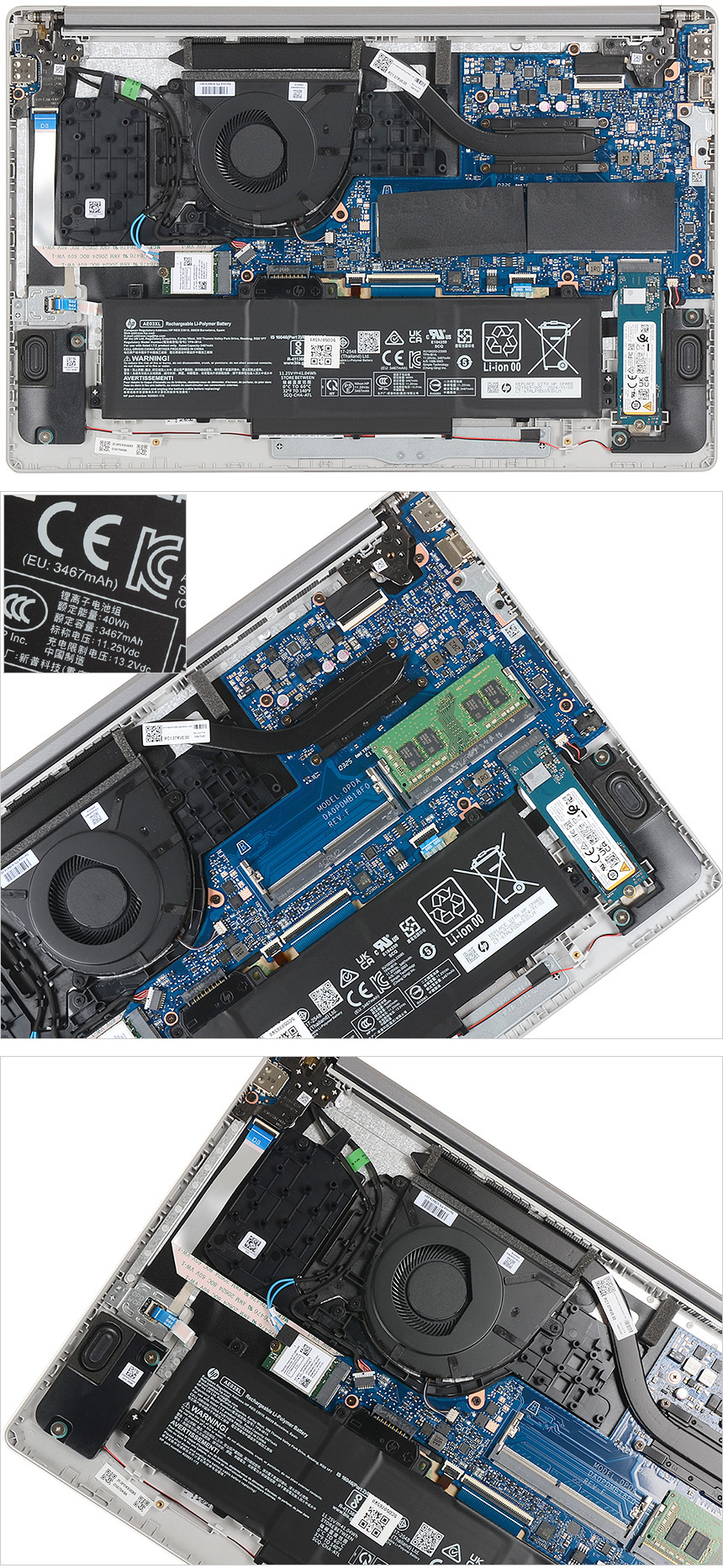바닥면 내부의 모습으로 CPU의 열을 식혀주기 위해 상단에 팬과 히트파이프가 설치되어 있으며 하단에는 3467mAh 용량의 3셀 리튬이온 배터리가 설치된 것을 확인할 수 있다. 또한하단 양 측며에는 스피커가 장착된 것도 눈에 띈다.