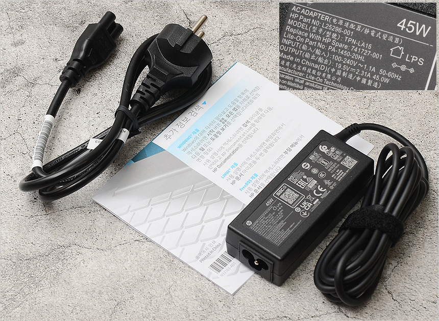 기본 제공되는 액세서리의 모습으로 45W 어댑터와 전원 케이블, 퀵 매뉴얼이 포함된 것을 확인할 수 있다.