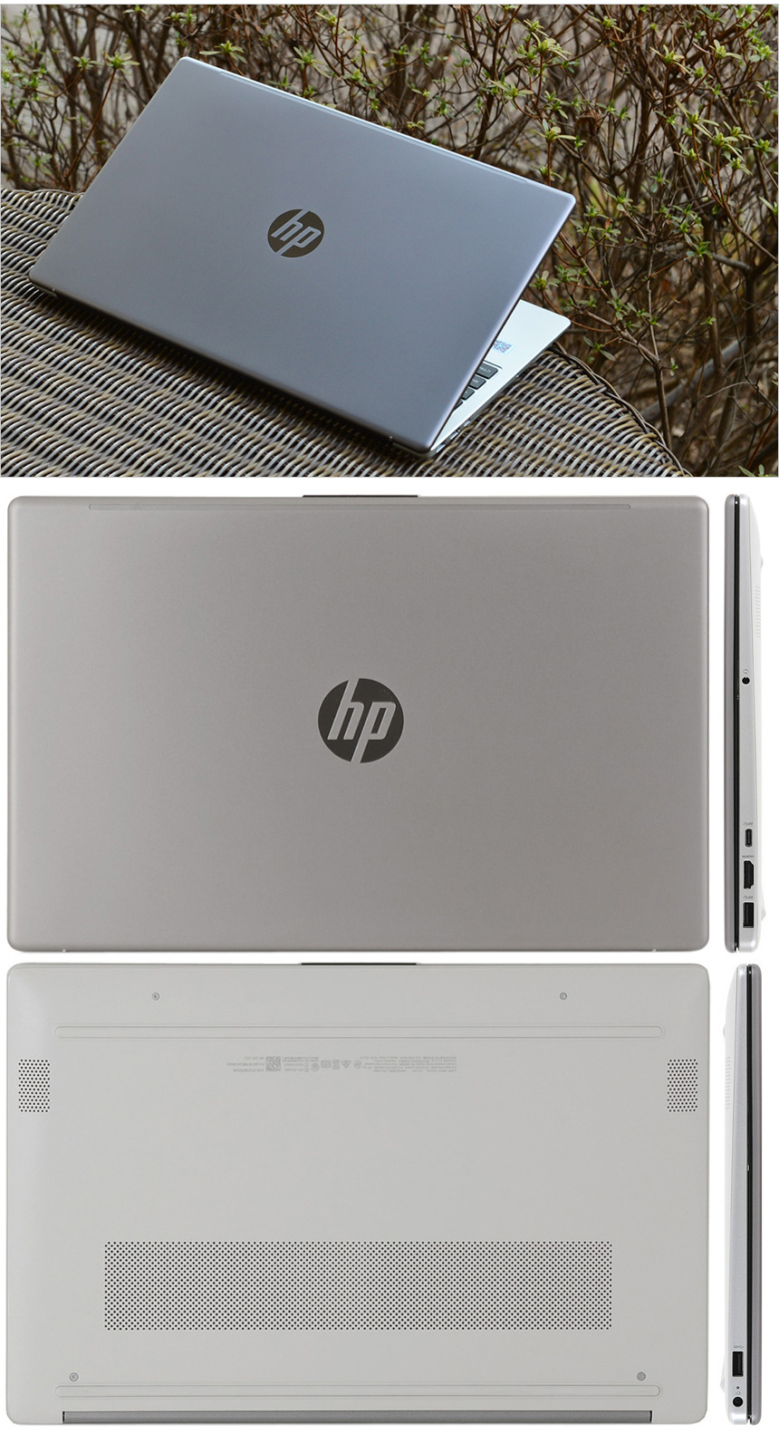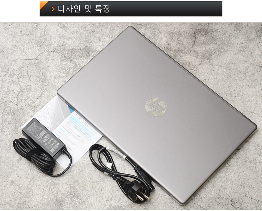 풀KIT 의 모습으로 노트북을 비롯해 45W 어댑터와 전원 케이블이 제공되며 퀵 매뉴얼이 포함된 것을 확인할 수 있다. @ 참고로 이 제품중 일부는 해양 플라스틱을 재활용하여 환경오염을 줄이며 (EPEAT 인증) 쉽게 재활용 할 수 있는 대안 포장재를 사용하고 있다. 환경을 생각하는 HP의 철학을 옅볼 수 있는 부분이다.