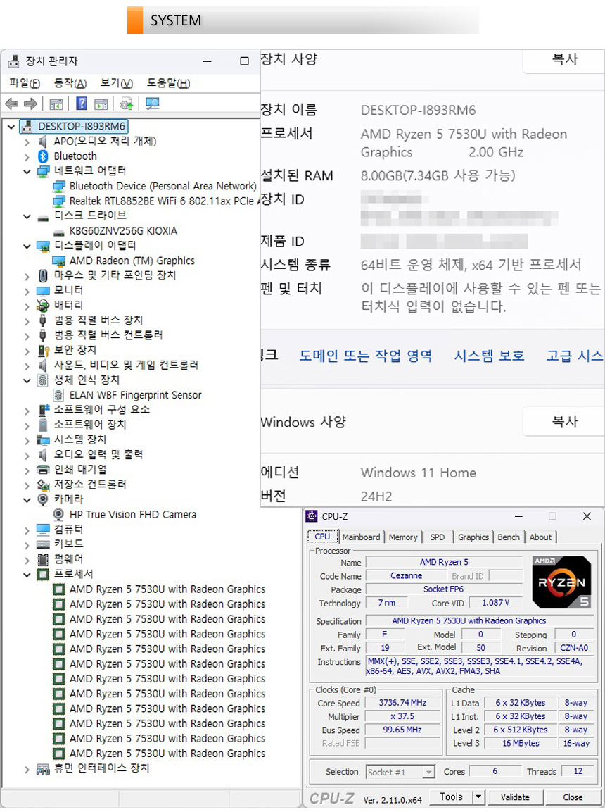 시스템 정보를 확인하고 있는 모습으로 6코어 12스레드에 16MB 캐시가 내장된 AMD 라이젠 5 7530U 프로세서가 탑재되어 보급형 노트북과 비교되는 높은 성능을 경험할 수 있다. 또한 8GB DDR4 메모리를 지원하며 256GB NVMe SSD가 장착되어 빠른 체감속도를 보여준다. 뿐만 아니라 FHD 웹캠이 장착되어 화상회의 등의 용도로 사용할 수 있으며 리얼텍 Wi-Fi 6 무선랜카드가 설치되어 고속 무선랜과 블루투스를 이용한 주변기기 무선연결이 가능하다.
