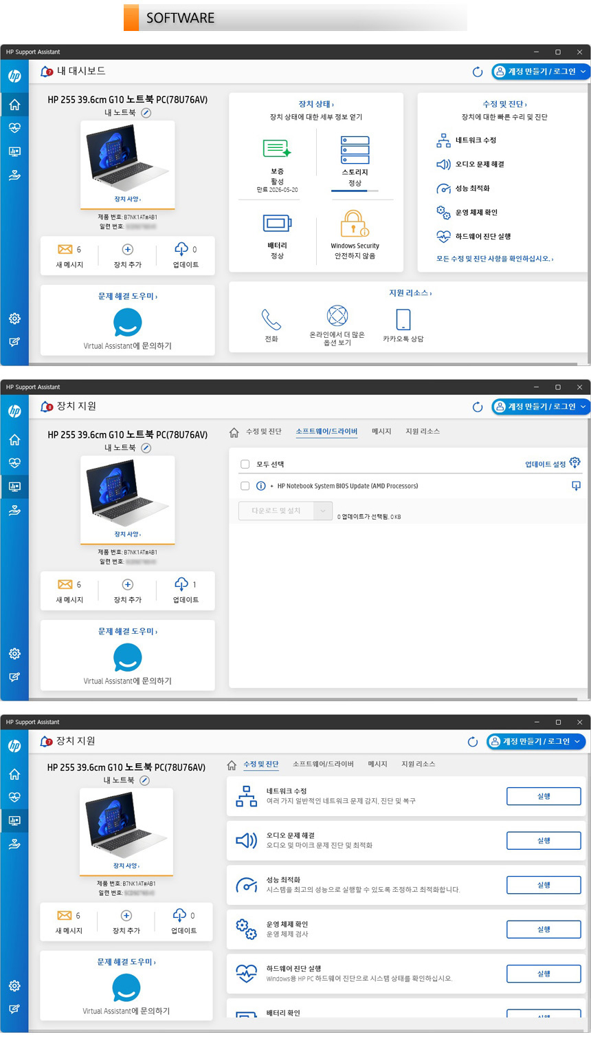 HP Support Assitant의 모습으로 시스템 업데이트를 지원해 최상의 컨디션을 유지할 수 있으며 진단 기능을 지원해 시스템에 문제가 생겼을 때 빠르게 파악하고 대응할 수 있다.