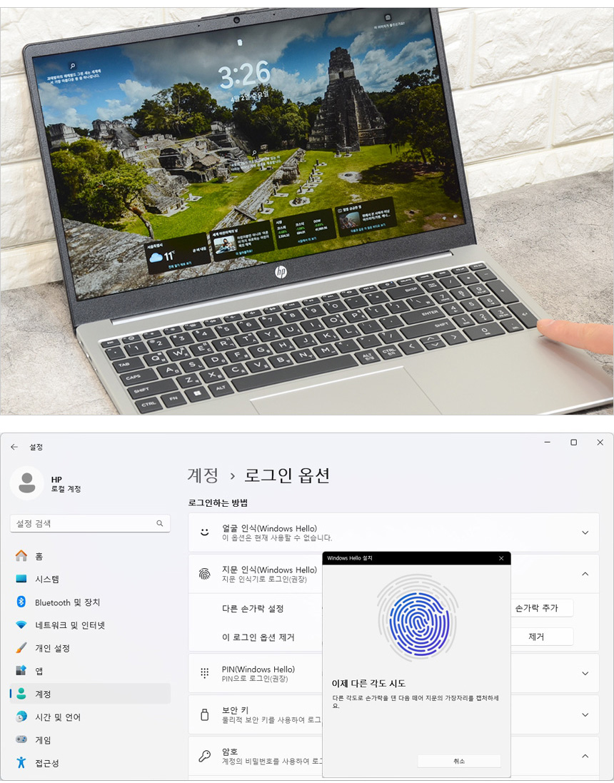팜래스트에 지문인식 센서를 장착해 보안성과 편의성을 높였다. 설정-계정에 있는 로그온 옵션에서 지문을 등록할 수 있으며 인식율도 뛰어나 집이나 회사 등에서 유용하게 활용할 수 있다. 중요 자료를 다룰 경우 안심하고 사용할 수 있는 노트북이다.