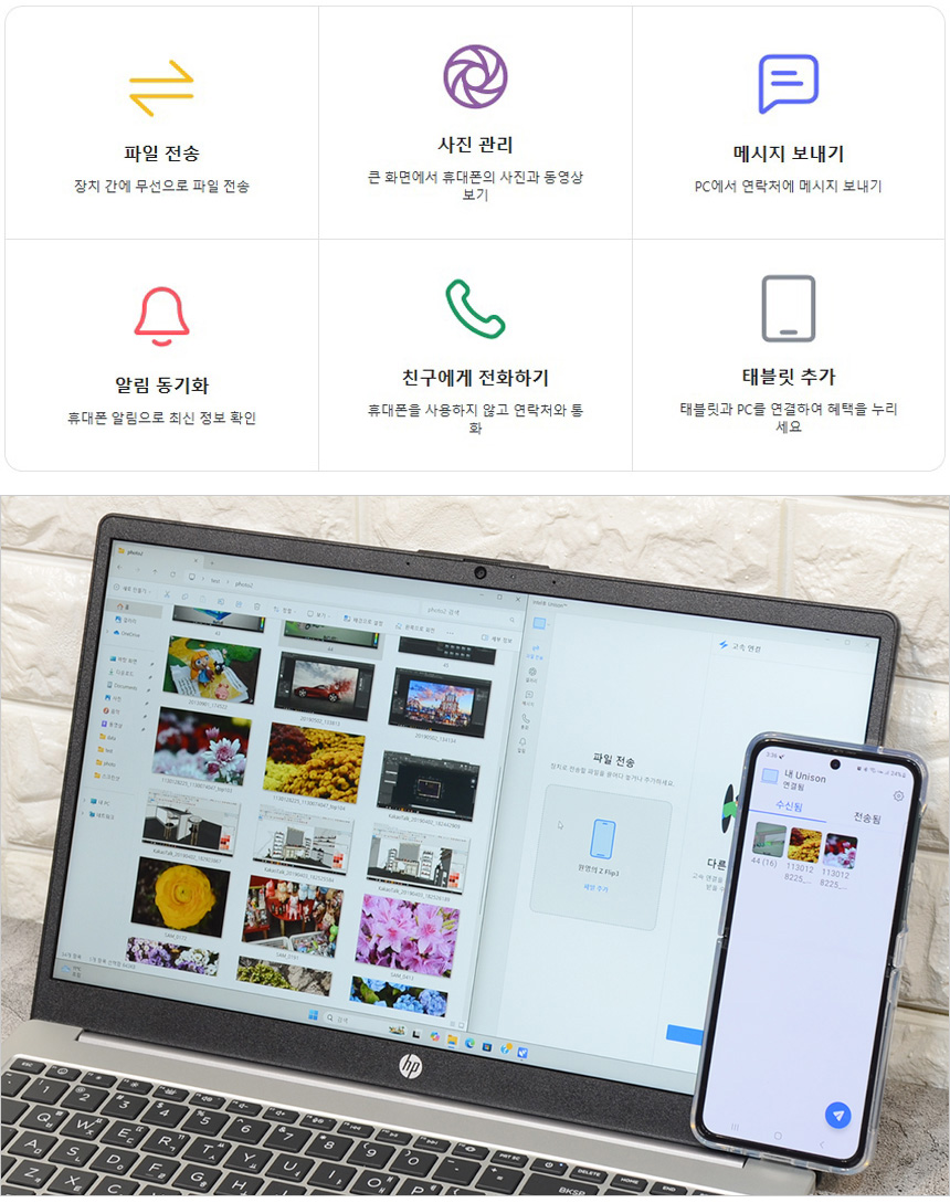인텔 유니슨을 사용하면 노트북에서 전화를 걸거나 문자 등을 전송할 수 있다. 또한 파일전송 기능을 제공해 사진과 같이 상호간 파일전송이 가능하다. (업무용으로 스마트폰을 사용하고 있다면 유용하게 기능을 활용할 수 있을 것이다.) @ 노트북과 스마트폰 모두 유니슨 앱이 설치되어 있어야 한다.
