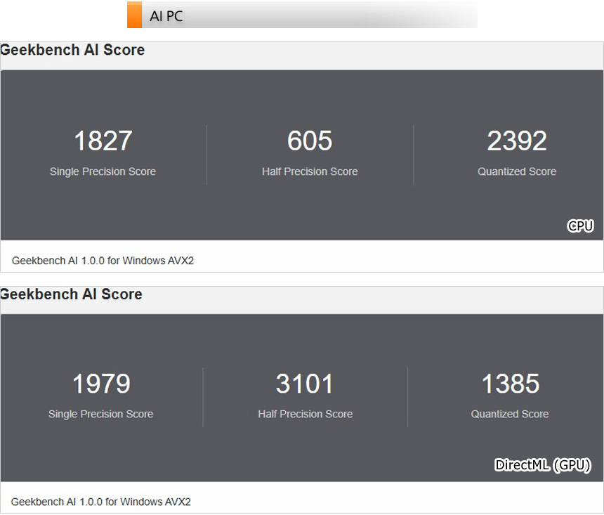 AI 전용 벤치마크 툴을 이용해 AI 성능 테스트를 진행하고 있는 모습으로 NPU가 탑재된 고성능 노트북들과는 다소 차이가 있지만 코파일럿 등은 충분히 실행할 수 있는 스코어를 보여주었다.