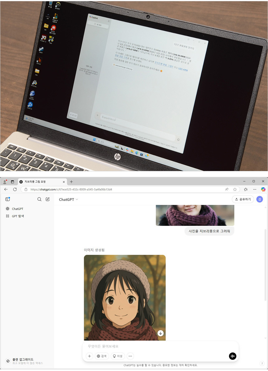 기본 설치된 코파일럿을 실행한 모습으로 궁금했던 부분을 쉽고 빠르게 알려주는 것을 확인할 수 있었다. (업무용으로 코파일럿을 유용하게 사용하고 있다. AI 가 막연하게 느껴지거나 활용해 보고 싶다면 우선 코파일럿부터 입문해 보기 바란다.) 또한 최근 프사로 많이 사용하는 지브리풍의 사진변환을 테스트 해 보았는데 (Chat GPT) 깔끔하게 이미지가 만들어지는 것을 확인할 수 있었다.