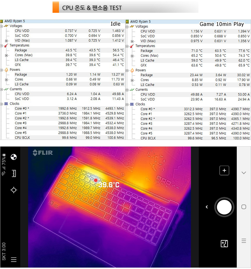 CPU 온도 테스트를 진행한 모습으로 (최고성능 모드, 사무실 온도 14도) 아무 작업도 하지 않는 Idle 상태에서는 40도 초반으로 작동했으며 게임을 10분 정도 플레이 했을 때 70도 초반까지 온도가 올라가는 것을 확인할 수 있었다. (계속 모니터링을 했는데 대부분 60도 후반에서 70도 초반을 유지했다.) 열화상 카메라를 이용해 게임 실행중 열분포도 확인해 보았는데 CPU가 설치된 좌측 상단을 중심으로 열이 퍼져나가는 것을 확인할 수 있었다. 팜래스트의 온도는 낮아 열로 인한 스트레스 없이 손을 올려두고 사용할 수 있다.