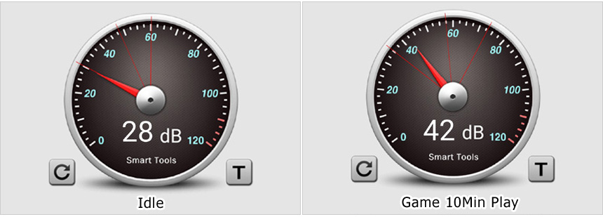 팬소음 테스트를 진행하고 있는 모습으로 (최고성능 모드) 아이들 상태나 문서작업시에는 생활소음에 묻혀 팬소음이 거의 들리지 않았으며 게임을 실행하면 팬이 최대 속도로 동작해 소음이 발생하는 것을 확인할 수 있었다.