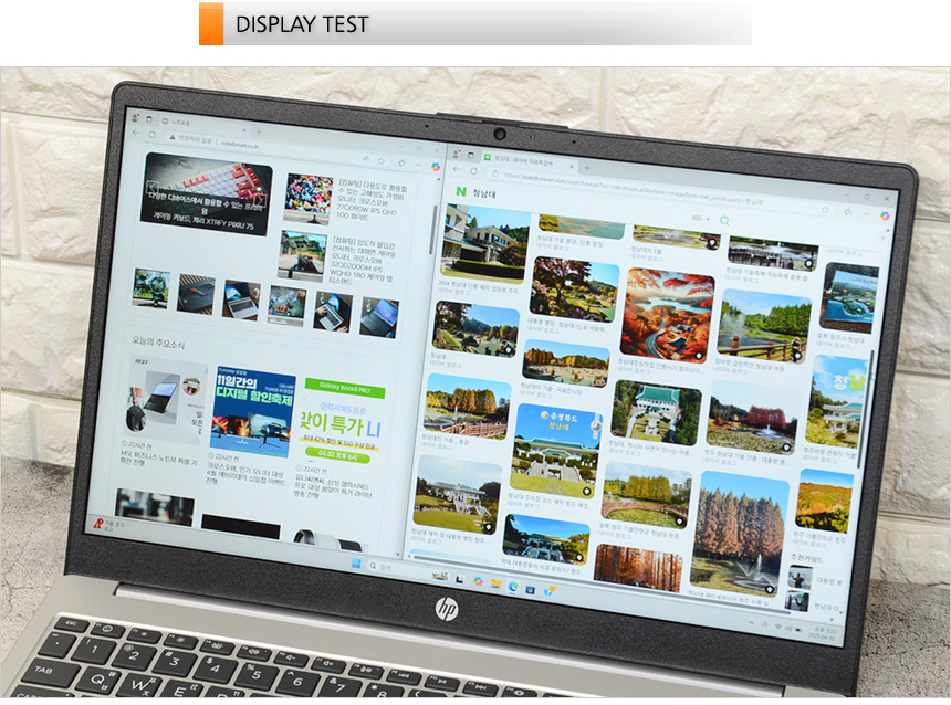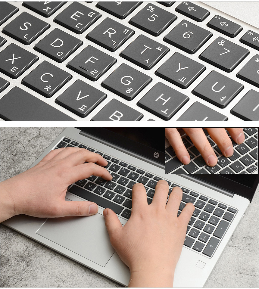 타이핑 테스트를 진행하고 있는 모습으로 키판의 흔들림으로 인한 키감저하 현상은 없었으며 치클릿 방식 특유의 넓은 키간격으로 여유로운 고속 타이핑이 가능했다. 키압은 낮은 편이지만 구분감은 확연해 눈으로 확인하지 않고도 오타없는 타이핑이 가능했으며 넉넉한 팜래스트 공간을 제공해 편하게 손을 올려두고 장시간 타이핑 할 수 있었다. (타이핑이 많은 직장인이나 대학생이 편하게 사용할 수 있는 노트북이다.)