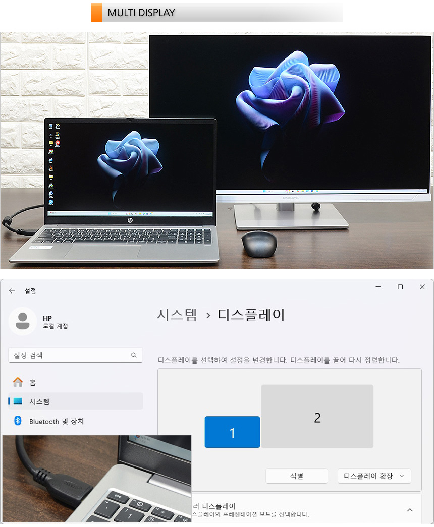 HDMI 단자를 지원해 듀얼 디스플레이를 활용할 수 있다. 상단의 사진은 4K 모니터를 연결한 모습으로 원활하게 작동하는 것을 확이날 수 있었다. 집이나 사무실에서 모니터를 연결해 사용하거나 회의실 등에서 TV나 프로젝터 등과 연결해 대화면으로 영상을 즐길 수 있다.