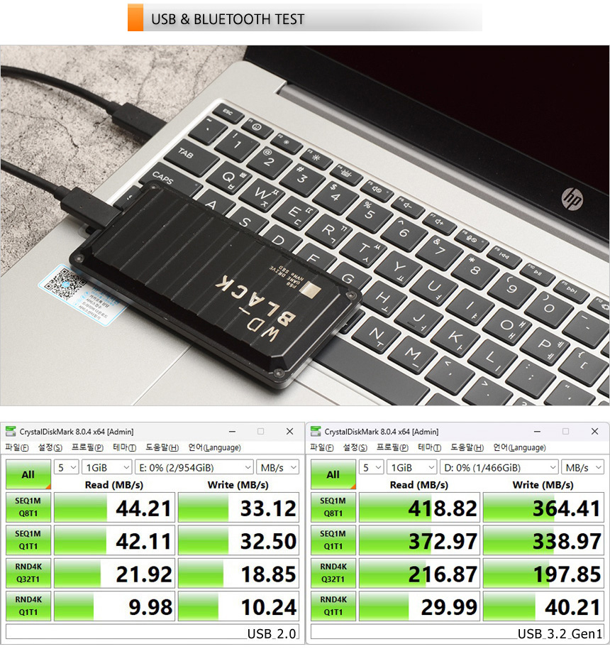 A타입과 C타입의 USB 3.2 Gen1 단자를 지원해 빠른 데이터 전송이 가능하다. 상단의 사진은 외장 SSD를 이용해 테스트를 진행하고 있는 모습으로 USB 2.0 과는 확연한 속도 차이를 보여주었다.