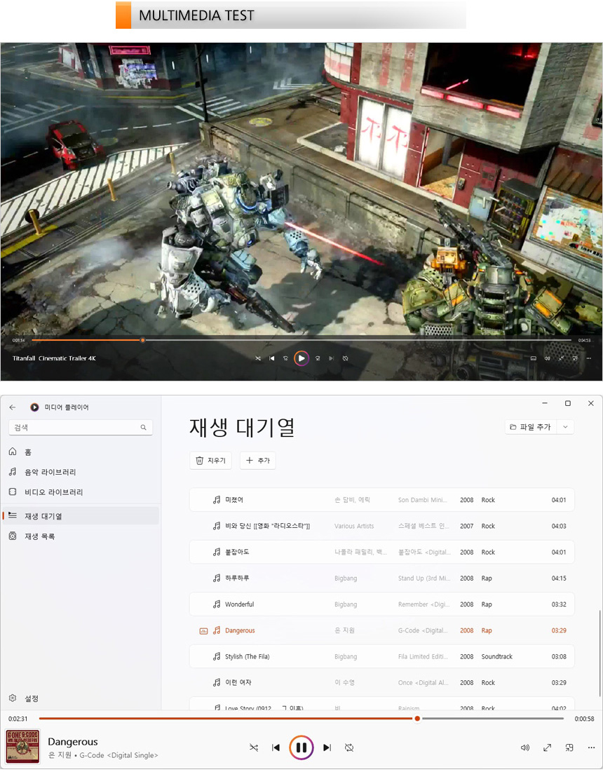 4K 동영상을 이용해 멀티미디어 테스트를 진행하고 있는 모습으로 슬림 베젤이 적용된 대화면 디스플레이 탑재로 높은 몰입감을 경험할 수 있었으며 시원시원한 사운드가 더해져 만족스럽게 영상을 즐길 수 있었다. 또한 MP3 파일을 이용해 사운드 테스트를 진행하고 있는 모습으로 중고음 뿐만 아니라 저음도 충분히 느낄 수 있었으며 높은 볼륨에서도 노이즈가 발생하지 않아 편안하게 음악을 즐길 수 있었다. (출력도 상당히 마음에 들었다.)
