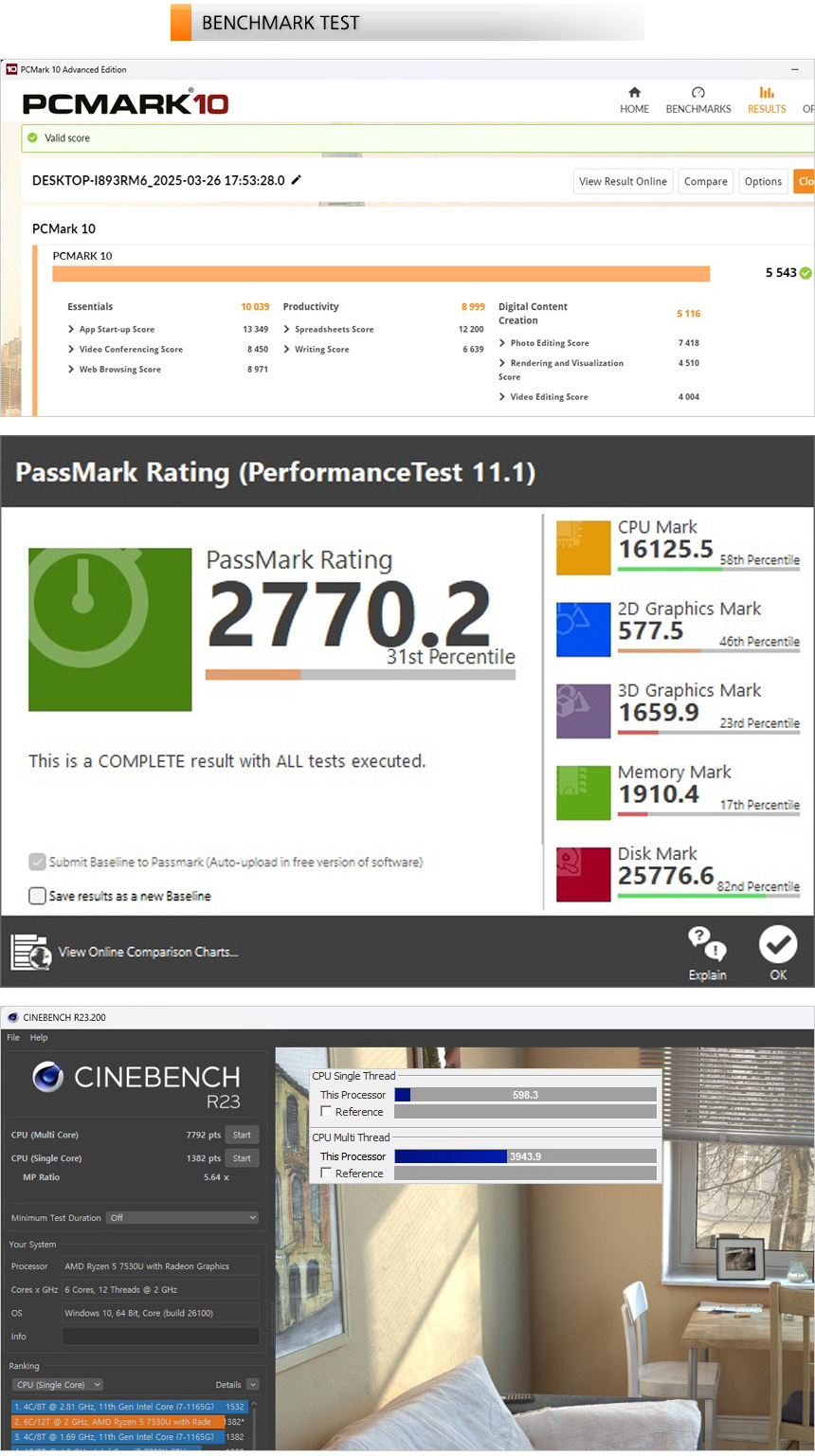 벤치마크 프로그램을 이용해 노트북의 성능을 확인하고 있는 모습으로 6코어 라이젠 5 프로세서가 탑재되어 대부분의 작업을 부드럽게 실행할 수 있는 스코어를 보여주었다. (4코어 라이젠 5가 탑재된 모델들과는 분명한 성능차를 보여주었다.) 업무용 S/W 사용이나 학습용으로 불편없이 사용할 수 있을 것이다.