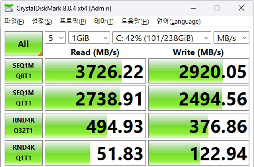 저장장치의 속도를 확인하고 있는 모습으로 NVMe SSD를 탑재해 HDD 나 SATA SSD 와는 확연히 비교되는 빠른 속도를 즐길 수 있다.