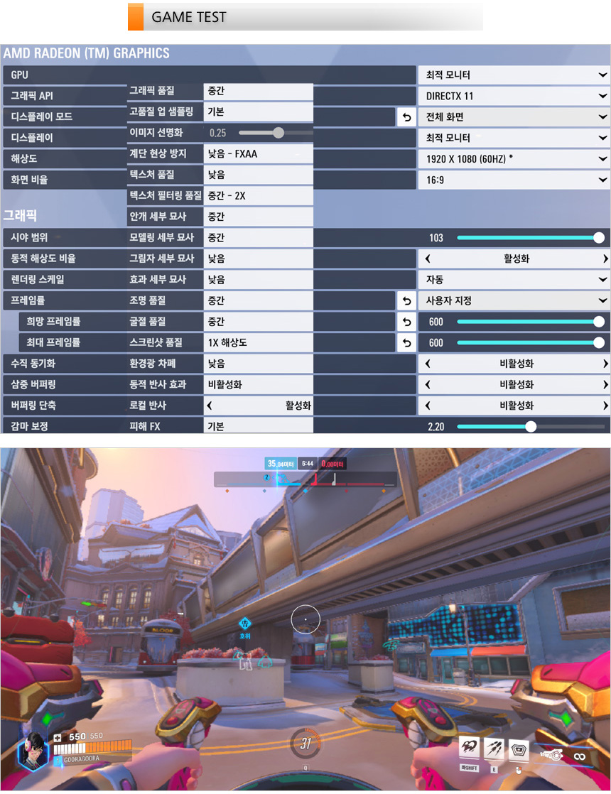 오버워치2를 이용해 프레임 테스트를 진행하고 있는 모습으로 중간 옵션에서 59-75 프레임을 보여주었다. 부드럽게 게임을 즐길 수 있을 것이다. (좀더 부드럽게 게임을 즐기고 싶다면 8GB 메모리를 추가해 듀얼채널을 구성하기 바란다.)