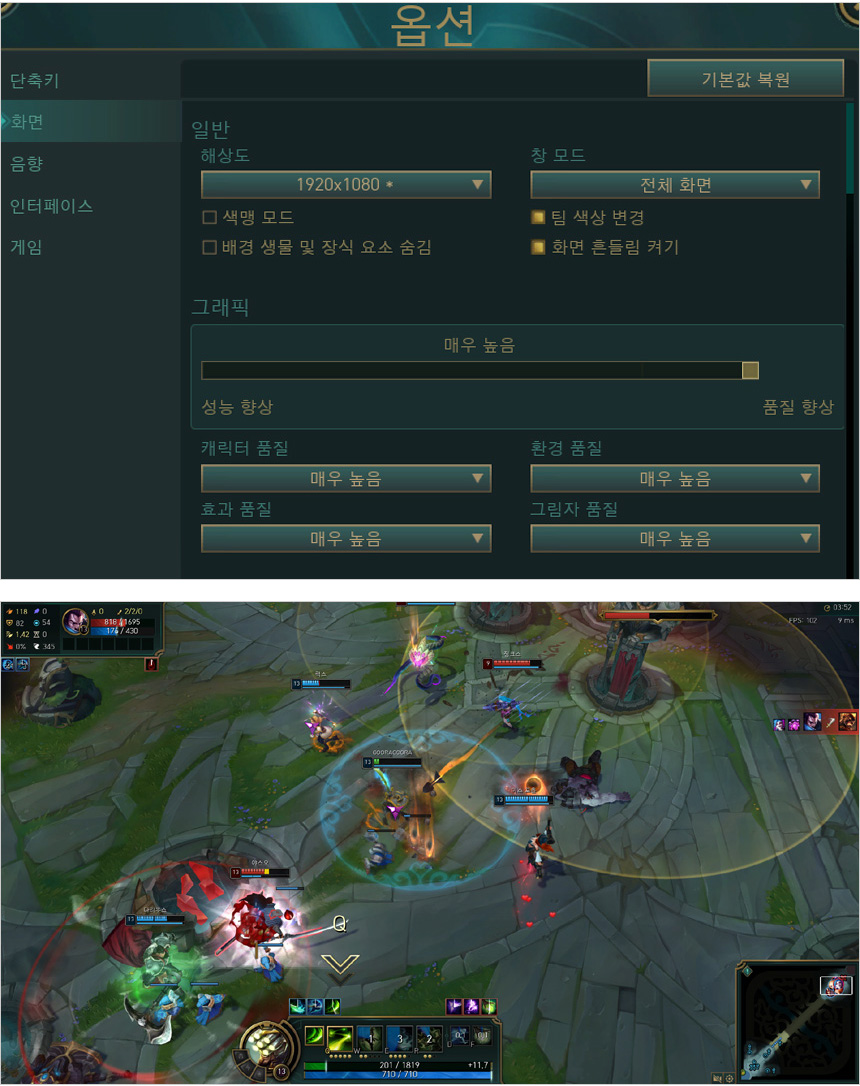 리그오브 레전드를 최고 옵션에서 플레이 하고 있는 모습으로 (연습 모드) 78-119 프레임으로 실행되는 것을 확인할 수 있었다. 멀티게임도 부드럽게 즐길 수 있다.
