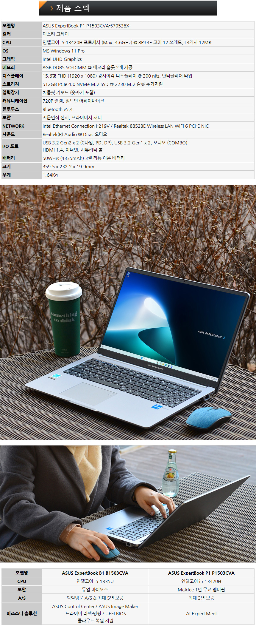 리뷰를 진행하는 ASUS ExpertBook P1 P1503CVA-S70536X 는 2024년 4분기 공개된 플래그쉽 모델인 ExpertBook P5에 이어 출시된 엑스퍼트 P 시리즈의 엔트리급 모델로 높은 가성비를 구현하는 것이 특징이다. 인텔코어 i5-13420H 프로세서를 탑재해 업무용 S/W 는 부드럽게 사용할 수 있으며 많은 창을 띄어두고 작업하는 멀티테스킹도 원활하게 실행할 수 있다.