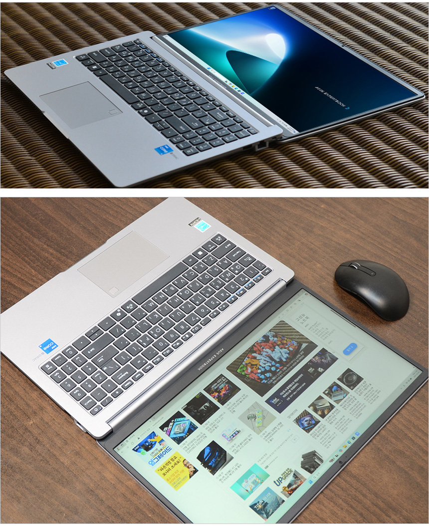 힌지 각도 조절에 제한이 있는 일반 노트북과 달리 180도 회전하는 힌지를 사용해 회의실에 모여있는 여러사람이 쉽게 화면을 공유할 수 있다. 특히 ASUS ExpertWidget에서 화면회전을 단축키로 설정해 주면 사진과 같이 화면이 회전해 미팅이나 소규모 프리젠테이션 등에서 유용하게 활용할 수 있다. (마우스는 화면 방향대로 움직여 양쪽에 앉은 사람 모두 노트북을 조작할 수 있다. 동영상을 통해 자세히 확인하기 바란다.)