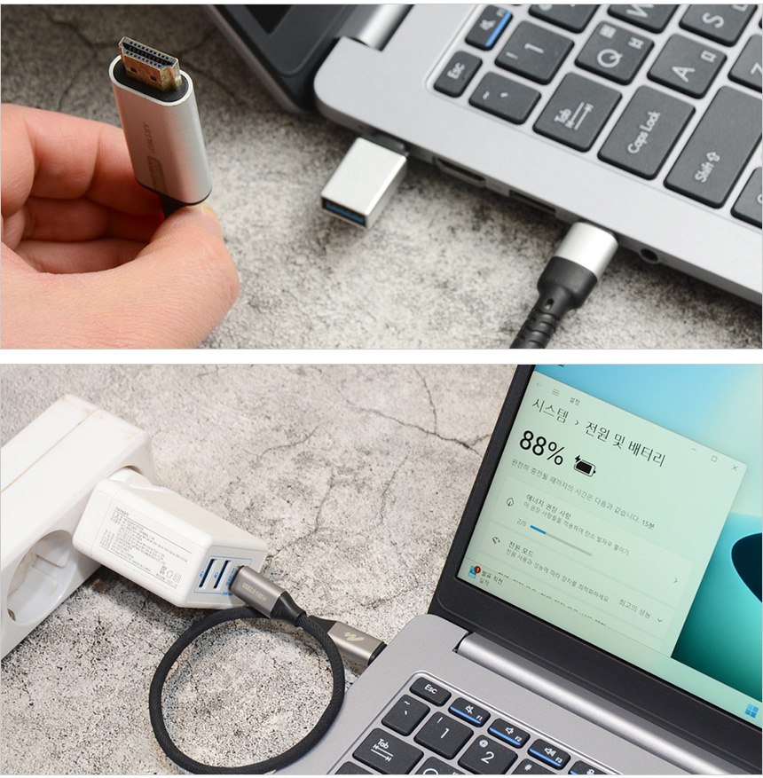 2개의 C타입 단자는 빠른 데이터 전송이 가능할 뿐만 아니라 디스플레이 출력 기능을 지원해 모니터나 프로젝터 등을 연결할 수 있으며 PD충전 지원으로 기본 어댑터 뿐만 아니라 시중에서 쉽게 구입할 수 있는 PD 충전기를 이용해 전원을 공급할 수 있다. 또한 젠더를 구입해 장착하면 A타입의 주변기기도 연결할 수 있다.