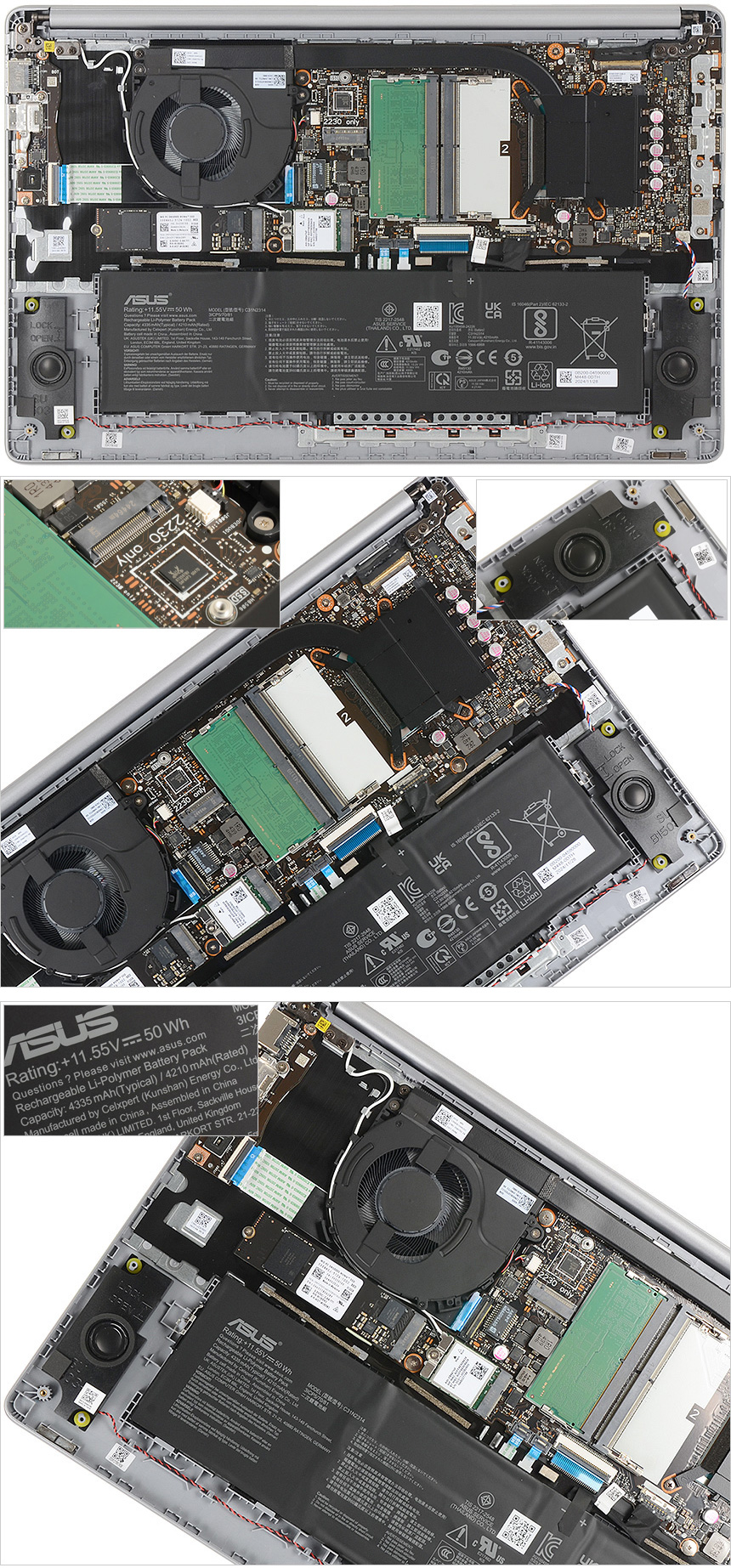 바닥면 내부의 모습으로 CPU 열을 식혀주기 위해 상단에 팬과 히트파이프가 설치된 것을 확인할 수 있으며 하단에는 4335mAh 용량의 리튬폴리머 배터리가 장착된 것을 확인할 수 있다. 또한 모서리 부분에는 스피커와 마그네틱이 부착된 것이 눈에 띈다.
