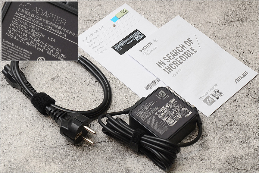 풀KIT 의 모습으로 노트북을 비롯해 65W 전원 어댑터와 전원 케이블이 제공되며 퀵 매뉴얼과 보증서가 포함된 것을 확인할 수 있다. 또한 M.2 SSD 추가 장착시 필요한 볼트와 써멀패드도 지원한다.
