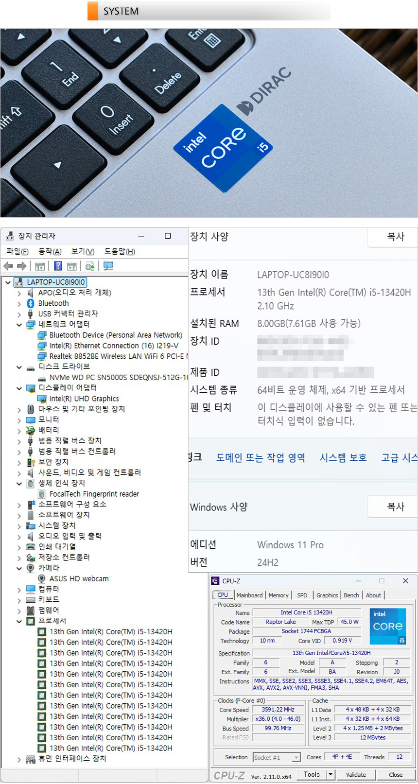 시스템 정보를 확인하고 있는 모습으로 4개의 성능코어와 4개의 효율코어 12MB 캐시로 구성된 13세대 인텔코어 프로세서 i5-13420H 가 탑재된 것을 확인할 수 있다. 또한 8GB 메모리를 지원하며 512GB SSD를 탑재해 빠른 체감속도를 경험할 수 있다.