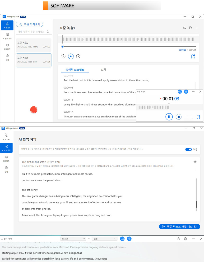ASUS ExpertBook 의 핵심 S/W 라 할 수 있는 AI ExpertMeet를 실행한 모습으로 AI 회의록을 지원해 컨퍼런스를 마치고 별도로 시간을 내어 회의록을 작성할 필요가 없다. 회의에 맞춰 녹음을 시작하면 음성이 녹음되면서 핵심 요점을 요약해 추후 간편하게 미팅 내용을 확인할 수 있다. 특히 녹음된 음성을 확인해 보았는데 음성이 대단히 깨끗해 상당히 놀랐다. 또한 다중화자 인식 기술이 적용되어 컨퍼런스 콜 이후 오디오가 텍스트로 표시될 때 말한사람을 명확하게 알 수 있도록 화자 ID를 표시해 구분해 준다.