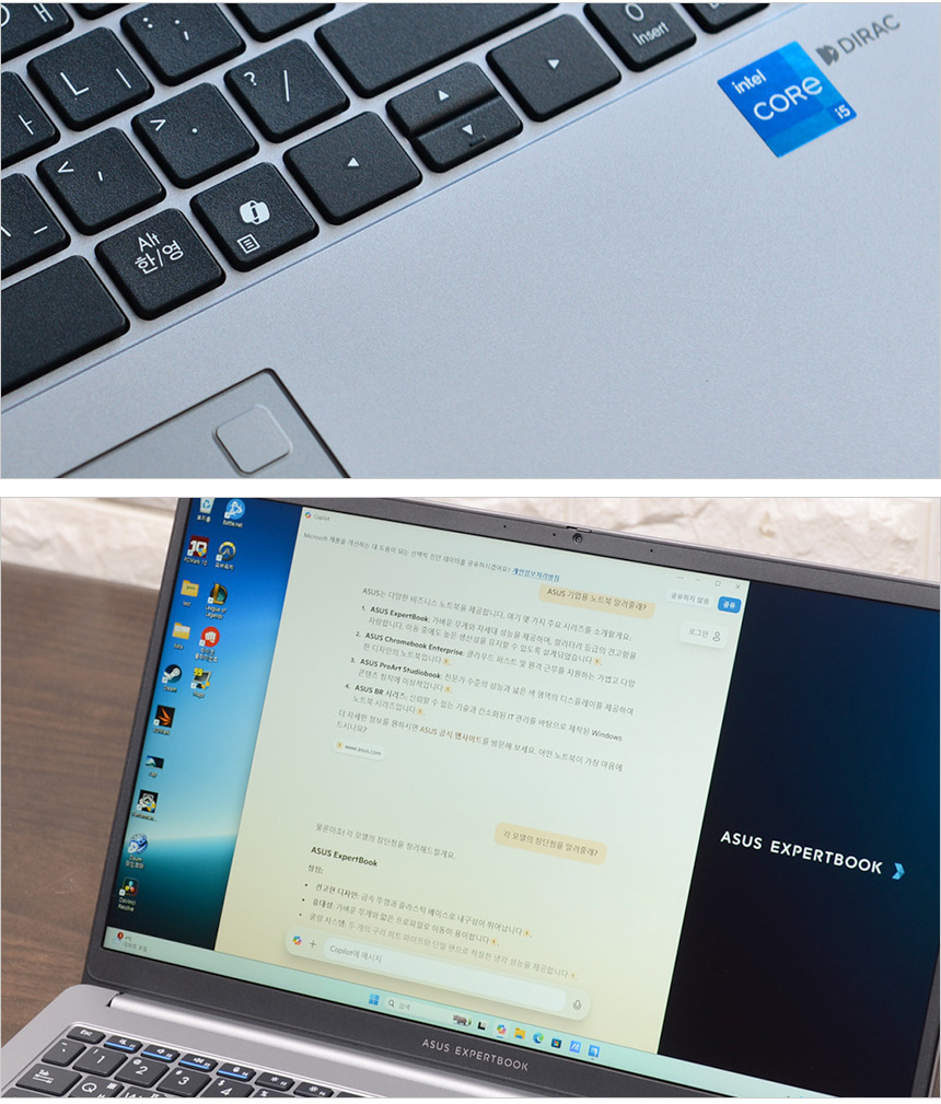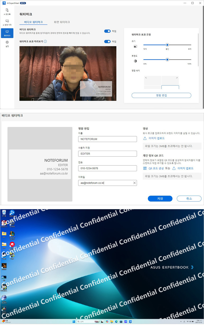 지원하는 S/W만 보면 확연한 차이를 느낄 수 있다. 외부의 침입을 방지하고 중요 데이터를 안전하게 관리할 수 있도록 돕는 S/W가 주를 이루는 대부분의 기업용 노트북 들과 달리 익스퍼트 북은 AI 회의 솔루션 ASUS AI ExpertMeet를 지원해 비즈니스 회의나 미팅시 큰 도움을 받을 수 있다. 실시간 양방향 번역과 자막 기능으로 원활한 커뮤니케이션이 가능할 뿐만 아니라 회의내용등을 자동 요약해 시간을 절약할 수 있다. 또한 공유화면에 워터마크를 적용해 구성원에게 자신을 확실하게 어필할 수 있으며 보안성도 높일 수 있다.