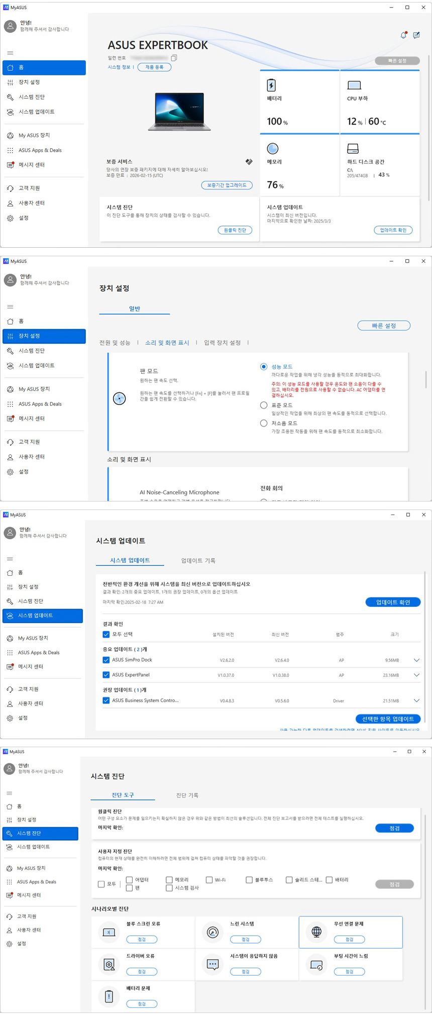 MyASUS 앱을 실행한 모습으로 노트북의 다양한 기능을 손쉽게 설정할 수 있으며 업데이트 기능을 지원해 손쉽게 최신 드라이버를 설치할 수 있다. 또한 원클릭 진단 기능을 지원해 시스템의 문제를 빠르게 파악할 수 있다.