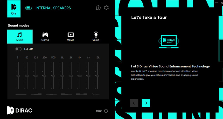 DIRAC 오디오를 지원하는 제품으로 전용앱을 통해 사용자의 취향이나 실행하는 컨텐츠에 맞게 음색을 설정할 수 있다. (프로파일 지정 뿐만 아니라 EQ 설정도 가능하다.)