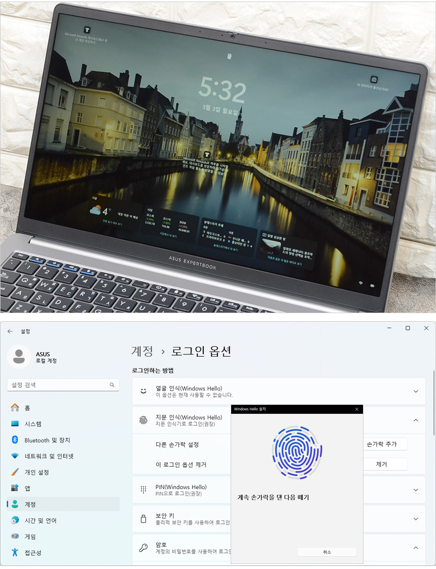 지문인식 센서가 장착되어 보안성을 한층 높일 수 있다. 설정-계정에 있는 로그온 옵션에서 지문을 등록할 수 있으며 인식율도 뛰어나 편하게 사용할 수 있었다. (높은 보안성을 요구하는 기업용 노트북 다운 선택이라 할 수 있다.)