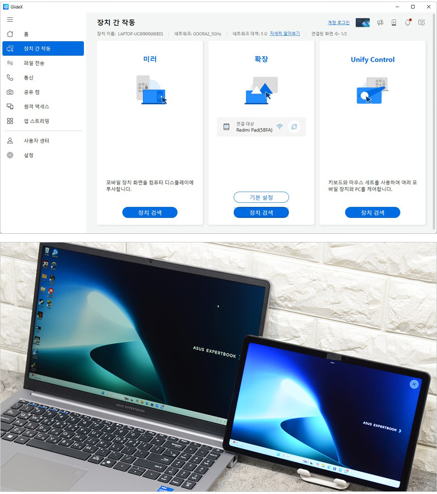 GlideX 앱을 지원해 화면의 복제나 확장, 유니파이 컨트롤이 가능하다. 상단의 사진은 확장 기능을 실행한 모습으로 태블릿 PC를 확장 모니터로 사용할 수 있었다. (참고로 미러를 선택하면 스마트폰 화면이 노트북에 표시된다.)
