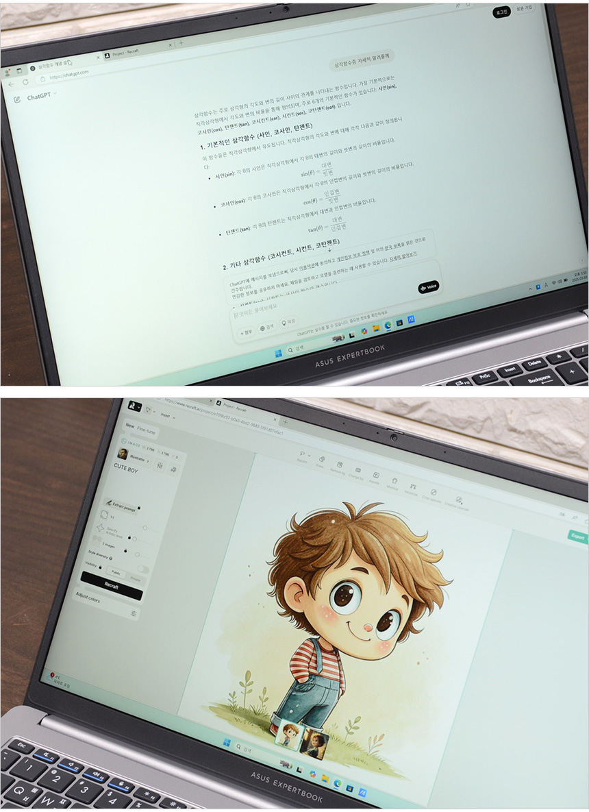 AI 대중화를 이끈 Ghat GPT를 실행한 모습으로 빠르게 실행되는 것을 확인할 수 있었으며 생성형 AI (ReCraft) 를 이용해 텍스트를 그림으로 만들어 보았는데 원활하게 작동하는 것을 확인할 수 있었다. (프로세서의 성능이 뛰어나 가벼운 AI 애플리케이션을 사용하는데 불편은 없을 것이다.)