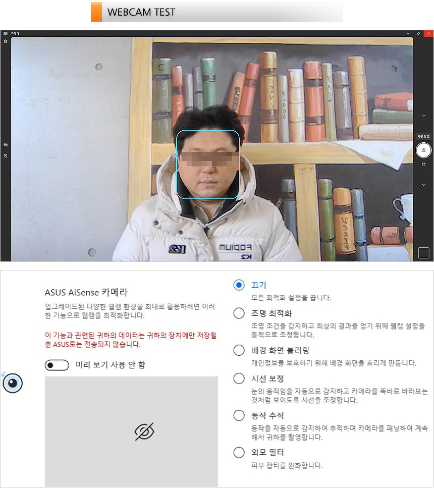 웹캠의 화질을 확인하고 있는 모습으로 FHD 웹캠대비 디테일이 떨어지긴 했지만 다소 어두운 실내였음에도 선명한 영상을 보여주었다. 특히 이 제품은 AiSence 카메라와 양방향 AI 노이즈캔슬링 기술이 적용된 제품으로 화상회의시 유용하게 활용할 수 있다.