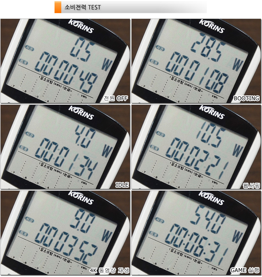 소비전력 테스트를 진행하고 있는 모습으로 (최고성능 모드) 캐주얼한 작업시에는 20W 이하의 저전력으로 작동했으며 게임 실행시에는 50W까지 소비전력이 올라가는 것을 확인할 수 있었다. (대부분의 게임 상황에서 40~50W로 플레이 되었다.)