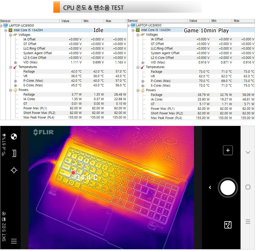 CPU 온도 테스트를 진행하고 있는 모습으로 (최고 성능 모드, 실내온도 12도) 아무것도 하지 않은 Idle 상태에서는 40도 초반대로 동작했으며 10분간 게임을 플레이 하고 측정했을 때 에는 70도 초반까지 온도가 올라가는 것을 확인할 수 있었다.