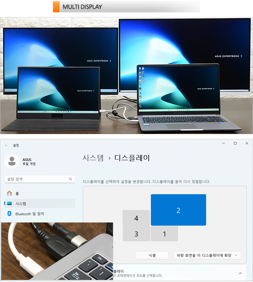 HDMI 단자 뿐만 아니라 2개의 C타입 단자가 디스플레이 출력을 지원해 3개의 모니터를 추가할 수 있다. 상단의 사진은 멀티 디스플레이 테스트를 진행하고 있는 모습으로 원활하게 작동하는 것을 확인할 수 있었다. 다중 모니터 사용이 필수적인 업무나 학습 환경에서 유용하게 사용할 수 있을 것이다.