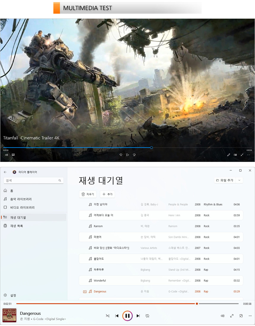 4K 동영상과 MP3를 이용해 멀티미디어 테스트를 진행하고 있는 모습으로 15.6형 대화면 지원으로 시원시원한 영상을 보여주었으며 DIRAC 오디오 지원으로 깔끔한 사운드를 들려 주었다. (프로파일 별로 음색 변화가 확연히 다른 것이 인상적이었다.) 동영상이나 음악 감상용으로 부족함은 느끼지 않을 것이다.