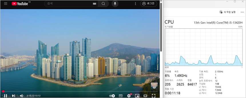 유튜브 고화질 동영상을 이용해 CPU 점유율을 테스트 하고 있는 모습으로 (2160P@60FPS) 5-20% 대의 점유율을 보여주었으며 인터넷을 실행했을 때 50% 초반까지 점유율이 올라가는 것을 확인할 수 있었다.