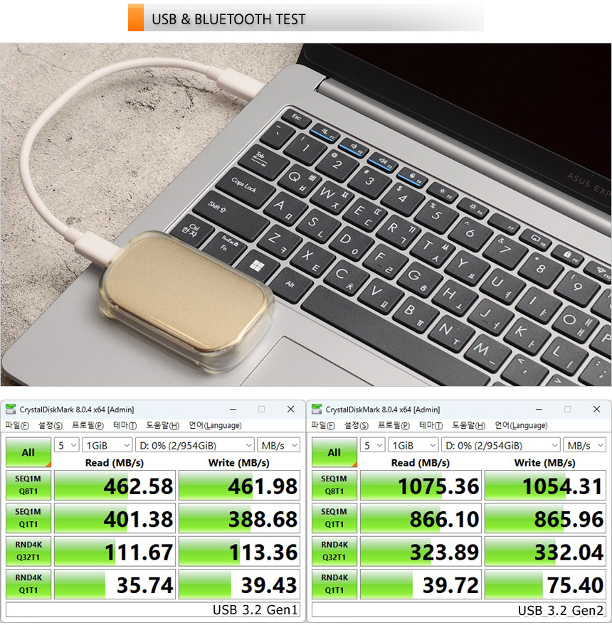 C타입 단자가 USB 3.2 Gen2를 지원해 빠른 데이터 전송이 가능하다. 상단의 사진은 USB 3.2 외장 SSD를 이용해 테스트를 진행하고 있는 모습으로 USB 3.2 Gen1 과 비교되는 빠른 속도를 보여 주었다.