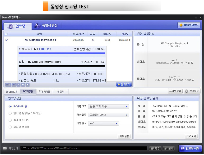 다음 팟인코더를 이용해 4K 동영상의 인코딩 테스트를 진행하고 있는 모습으로 3분 45초의 짧은 인코딩 시간을 보여주었다.
