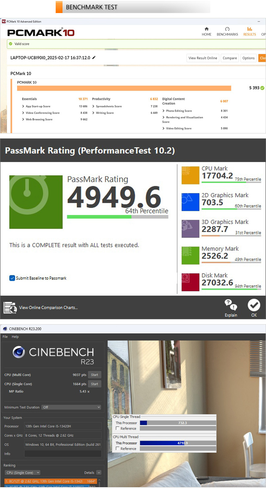 벤치마크 프로그램을 통해 기기의 성능을 확인하고 있는 모습으로 일반적인 업무용 S/W 장도는 부드럽게 실행할 수 있는 높은 스코어를 보여주었다. 펜티엄이나 인텔 N프로세서가 탑재된 제품들과는 분명한 성능 차이를 경험할 수 있을 것이다.