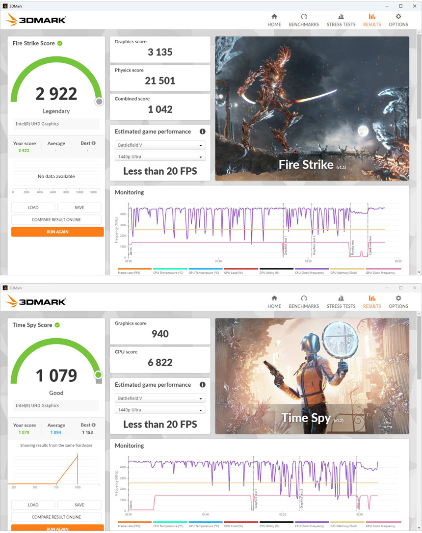 3DMARK를 이용해 3D 성능을 확인하고 있는 모습으로 캐주얼한 온라인 게임은 충분히 실행할 수 있는 스코어를 보여주었다.