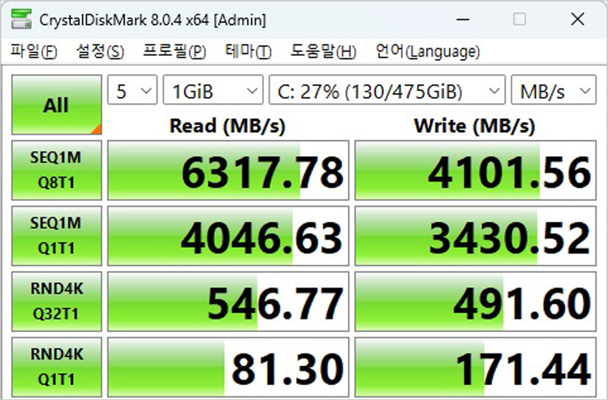 저장장치의 속도를 확인하고 있는 모습으로 PCIe 4.0 NVMe M.2 SSD 가 기본 장착되어 일반 보급형 노트북들과 비교되는 빠른 속도를 즐길 수 있다. 특히 512GB 대용량을 지원하고 M.2 슬롯을 추가 지원해 대용량 데이터를 여유롭게 저장할 수 있다.